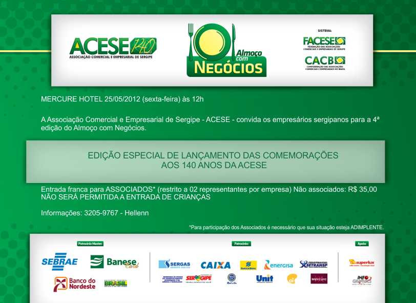 A 4ª edição do Almoço com Negócios promovido pela ACESE na última sexta-feira, 25 - num formato especial em comemoração aos 140 anos da entidade empresarial mais antiga do estado -, foi um sucesso.
