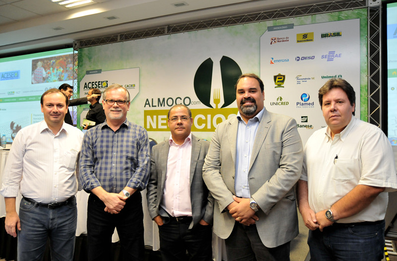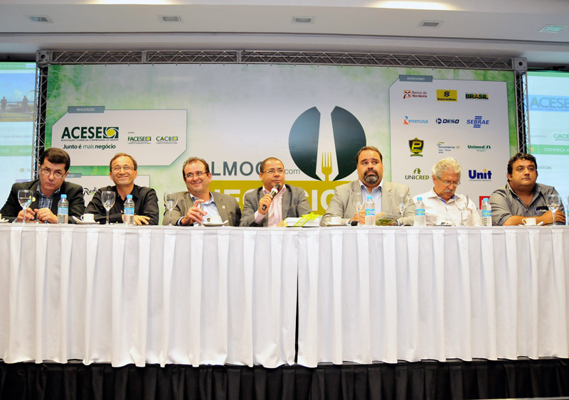 Compuseram a mesa, além do palestrante, o presidente da Acese, Wladimir Torres, o reitor da Universidade Federal de Sergipe, Ângelo Antoniolli, o vice-presidente da Acese, Robson Pereira, Manoel Macedo, da Embrapa, Márcio Carvalho, presidente do Ipaese e Renato Dantas, do Banese.